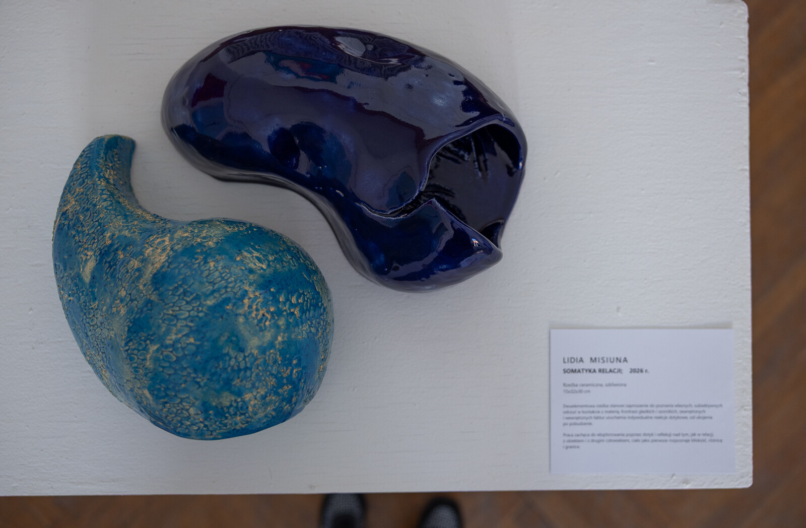 Pokazuję także ceramiczną rzeźbę „Somatyka relacji”, która zaprasza do doświadczenia materii poprzez dotyk. Kontrast faktur - gładkich i szorstkich, wewnętrznych i zewnętrznych, uruchamia indywidualne reakcje ciała i przypomina, że w relacji to właśnie ciało często jako pierwsze rozpoznaje bliskość, różnicę i granice.